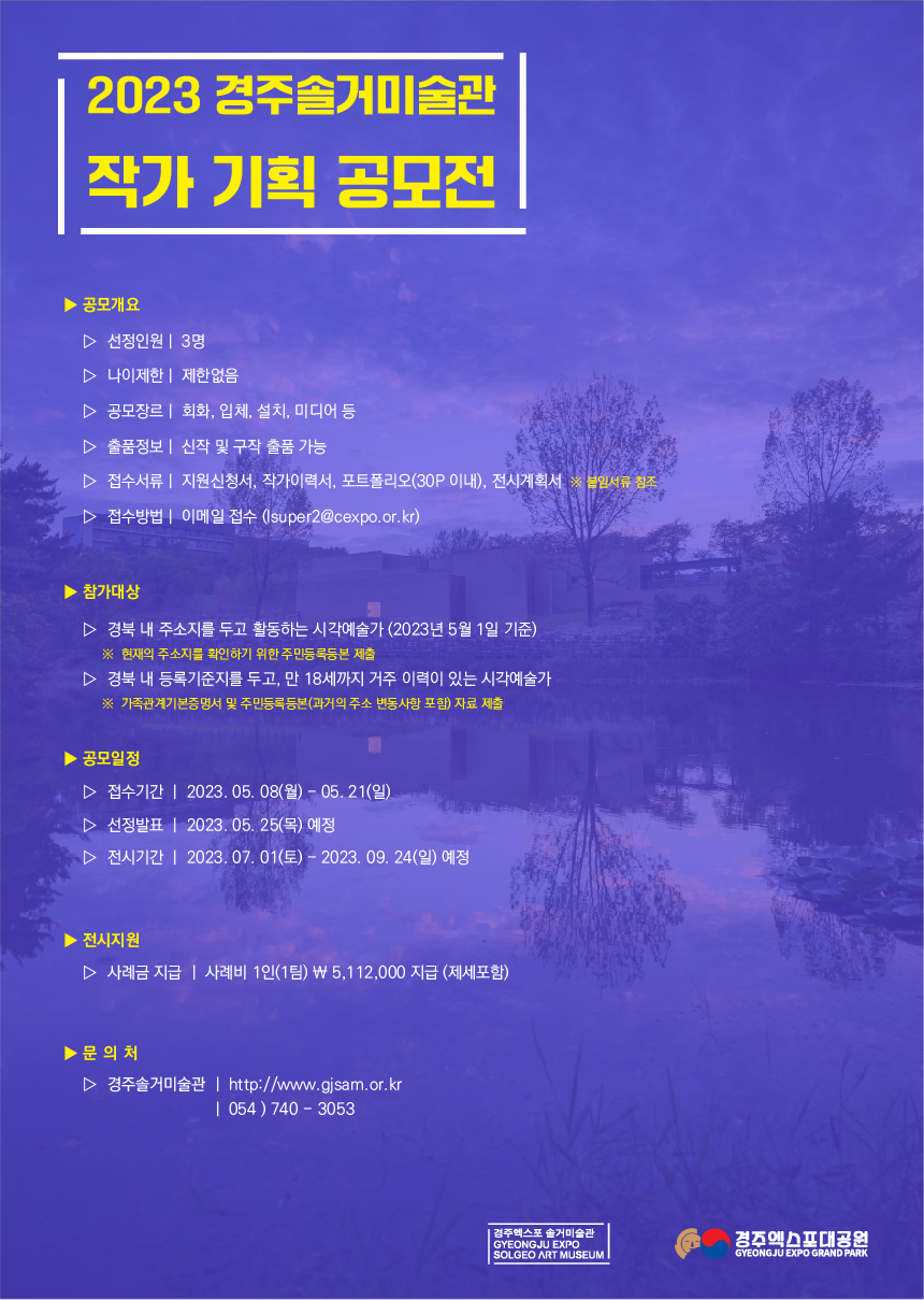 경주솔거미술관은 시각예술작가의 역량제고와 실험적 작품세계를 펼칠 수 있는 기회를 제공하고 경북미술의 발전에 기여하는 공립미술관으로서의 공익 실현을 위해 ‘2023 경주솔거미술관 작가 기획 공모전'을 마련했다.