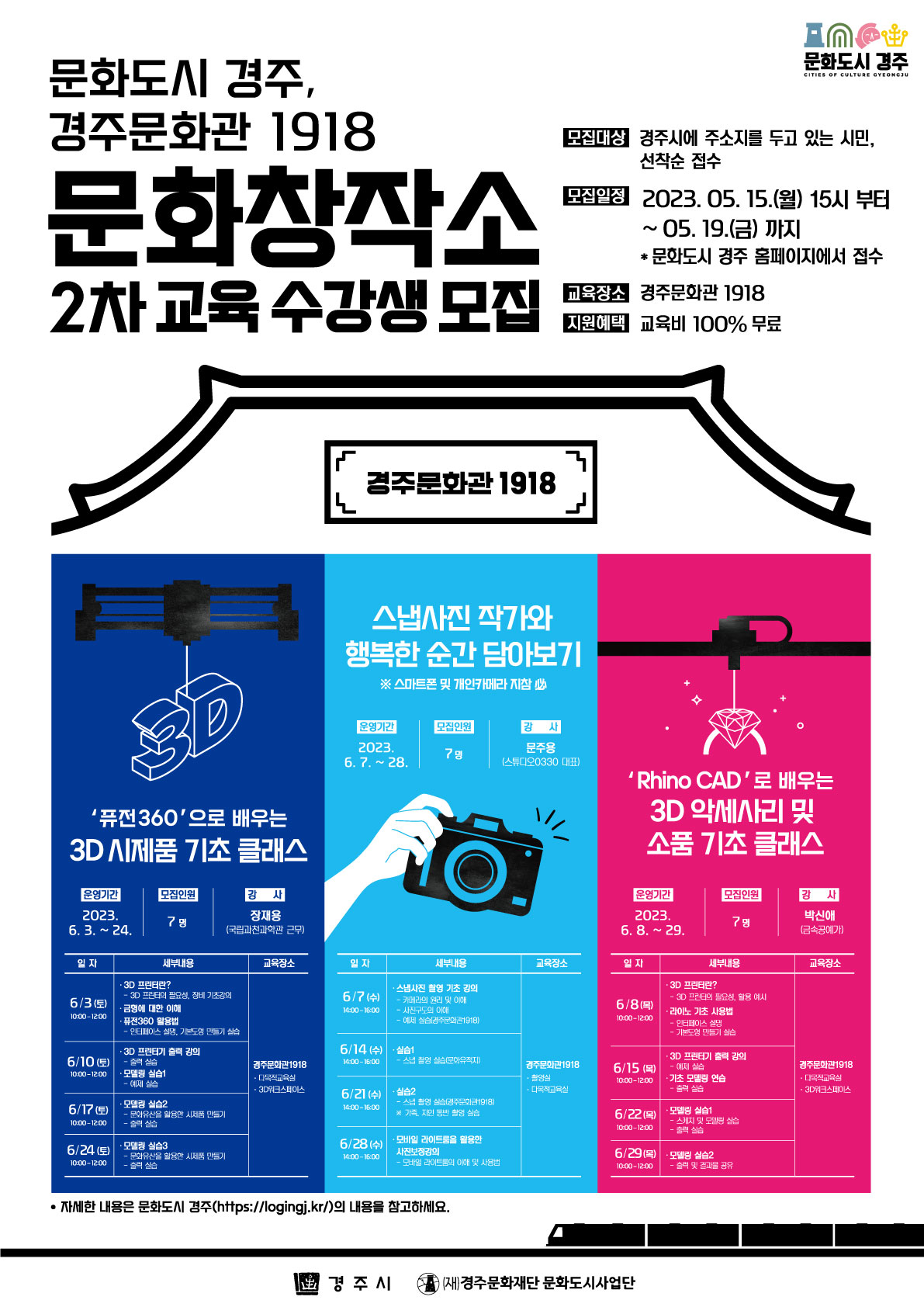 경주문화관1918 문화창작소 교육프로그램은 경주 문화도시 예비사업의 일환으로 6월 한달 간 총 4회차 과정으로 운영되며, 경주시민이라면 무료로 수강 가능하다.