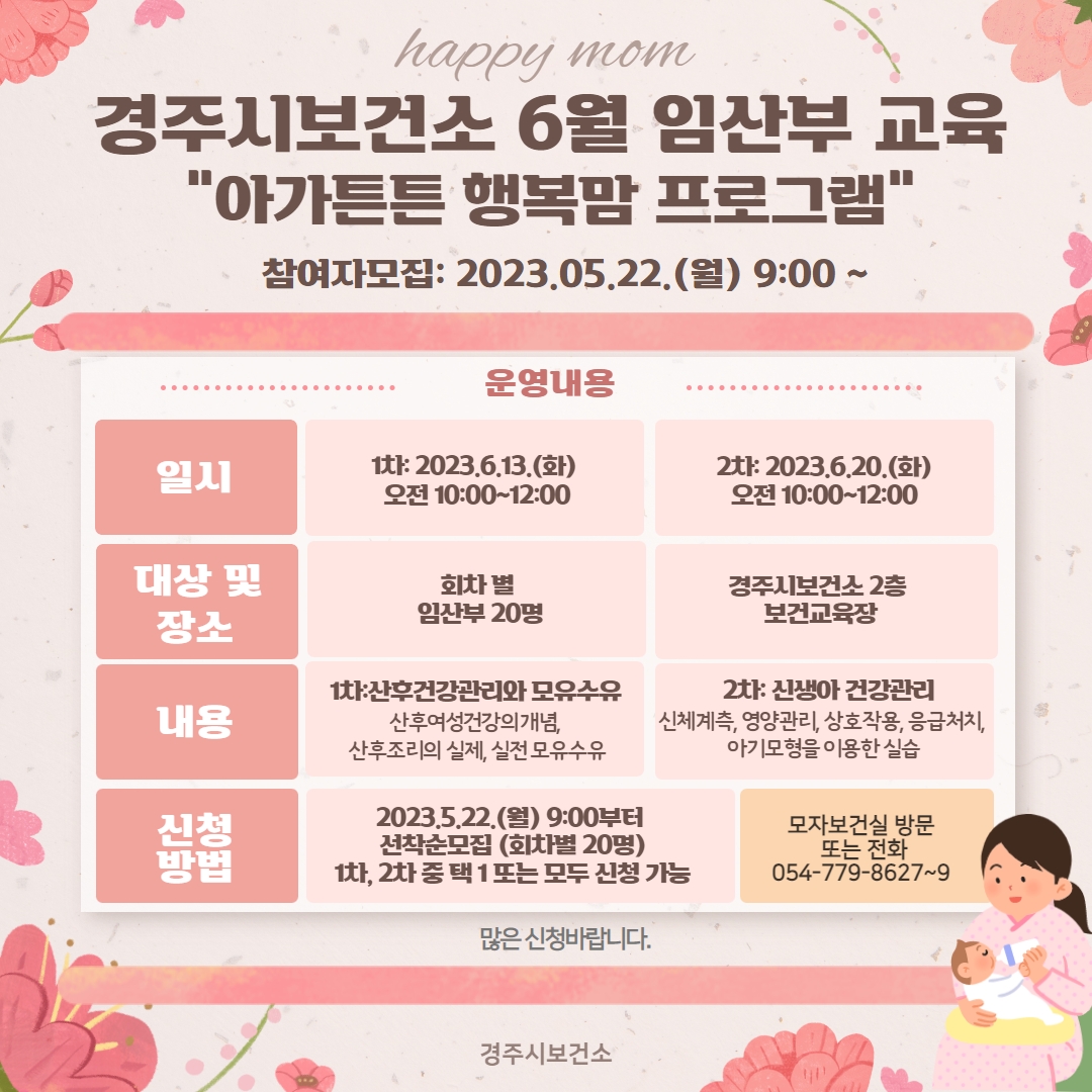 【경주=미디어인경북】 경주시보건소는 건강하고 행복한 출산을 위해 오는 6월 임산부를 대상으로 건강관리 교육 프로그램을 진행한다.