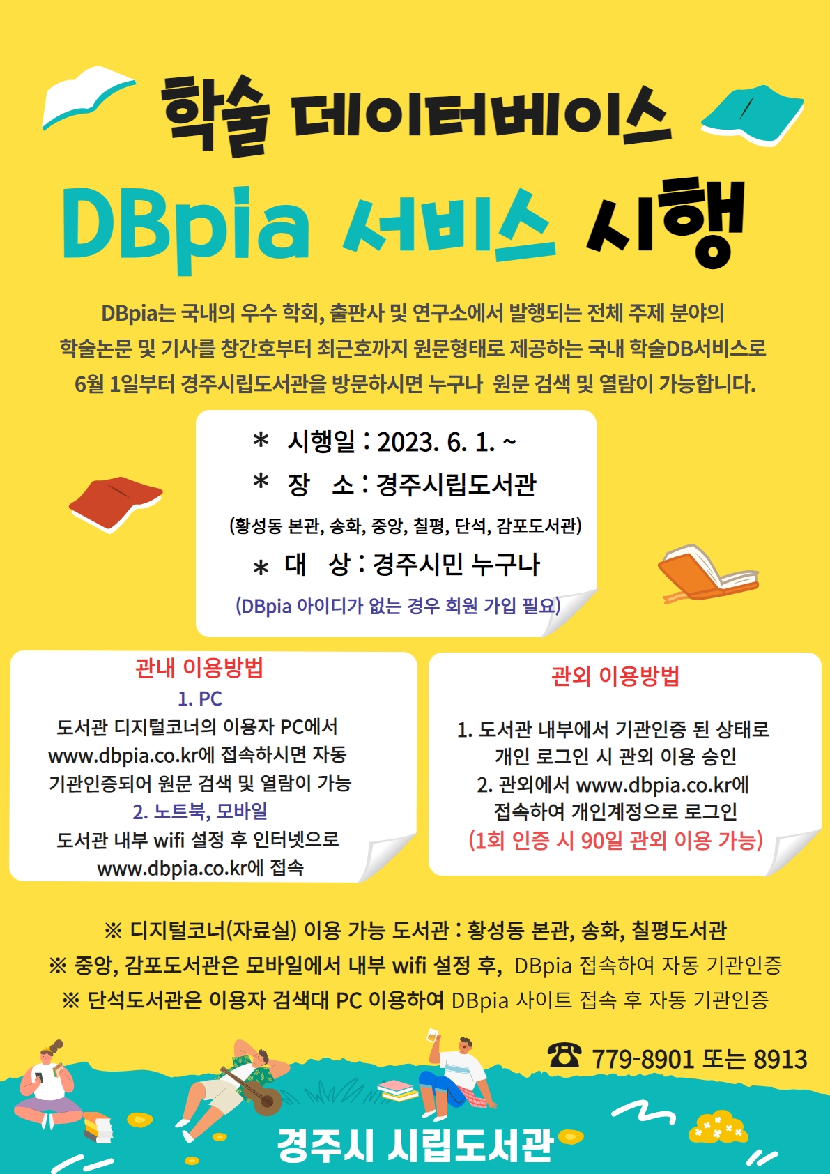 【경주=미디어인경북】 경주시립도서관은 6월부터 시민들을 대상으로 학술‧지식 정보를 무료로 제공하는 학술 데이터베이스(DBpia) 열람 서비스를 시행한다고 24일 밝혔다.