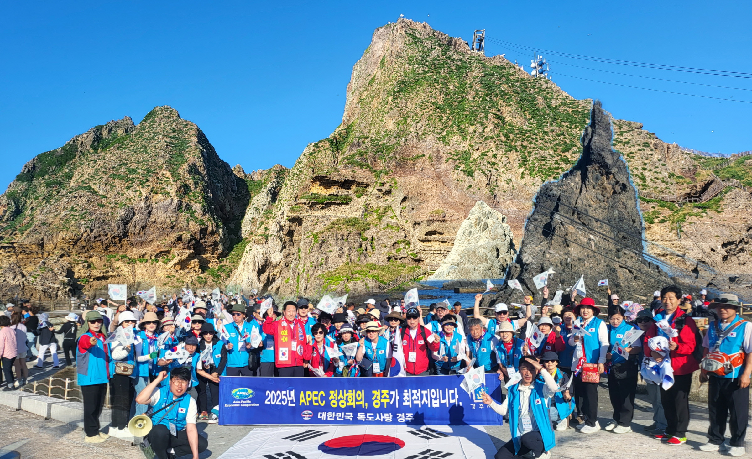 【경주=미디어인경북】 영원한 대한민국의 영토 독도에서 독도 수호와 2025 APEC 정상회의 경주 유치를 위한 결의 퍼포먼스가 펼쳐졌다.
