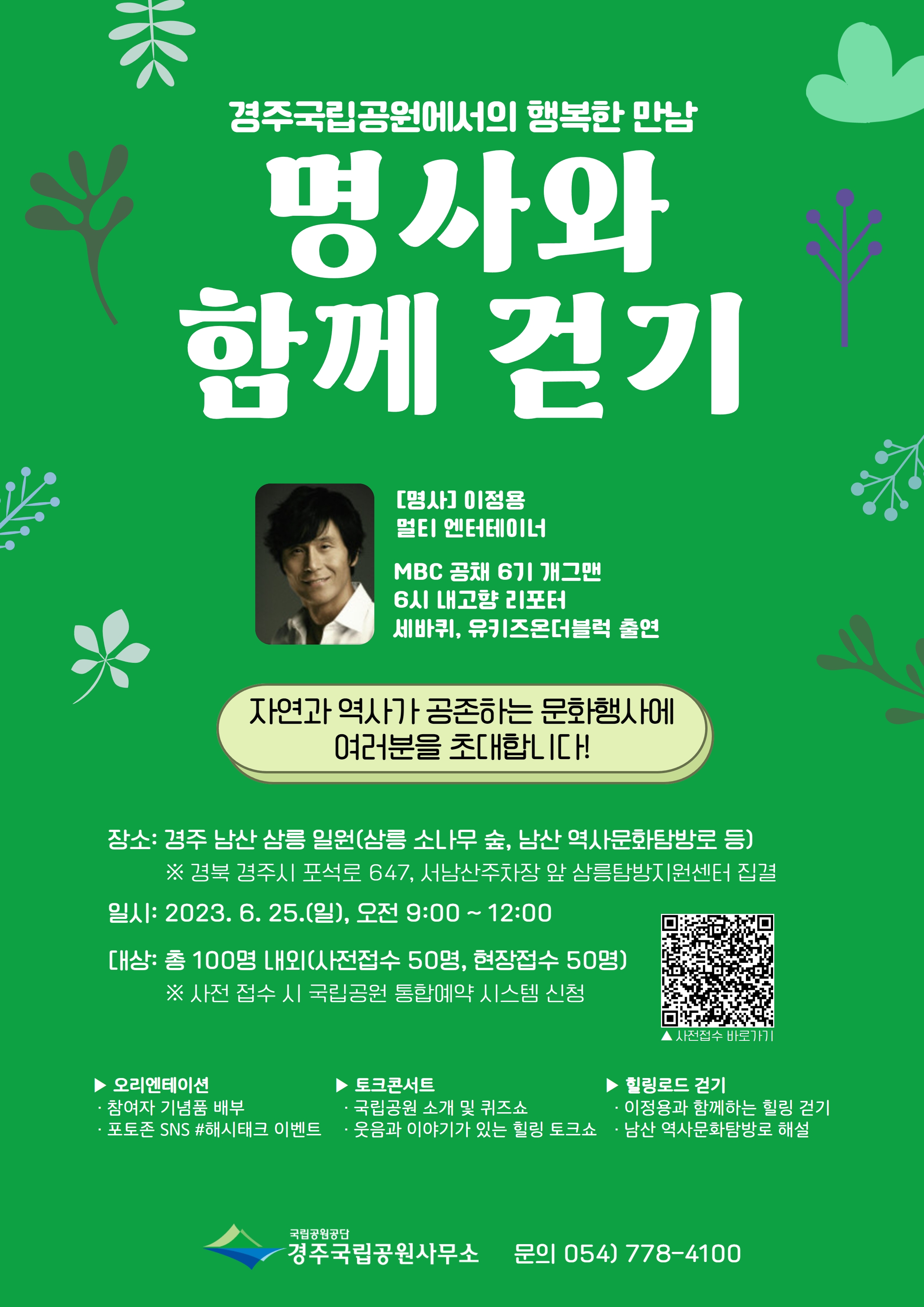 행사의 주요 내용은 ‘웃음과 이야기가 피어나는 삼릉 소나무 숲 속 토크콘서트’, ‘배우 이정용과 함께 걷는 경주국립공원 힐링로드’ 이며, 참가신청은 국립공원예약통합시스템(reservation.knps.or.kr)을 통한 사전예약과 행사 당일 현장에서 가능하다.