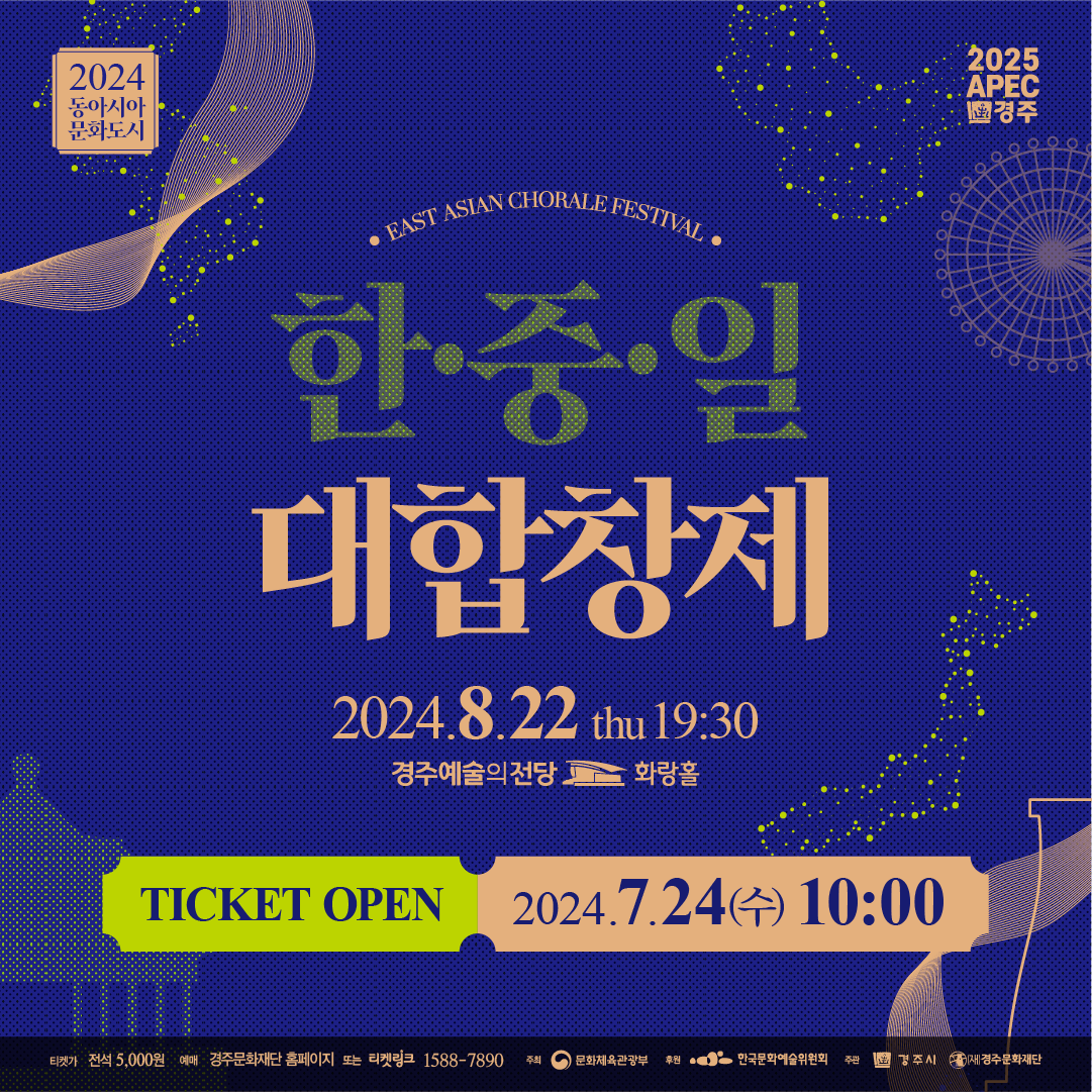 【경주=미디어인경북】 문화체육관광부가 주최하고 한국문화예술위원회, 경주시, 경주문화재단이 주관하는 동아시아 문화도시 <한·중·일 대합창제>가 오는 8월 22일(목) 오후 7시 30분 경주예술의전당 화랑홀에서 개최된다.