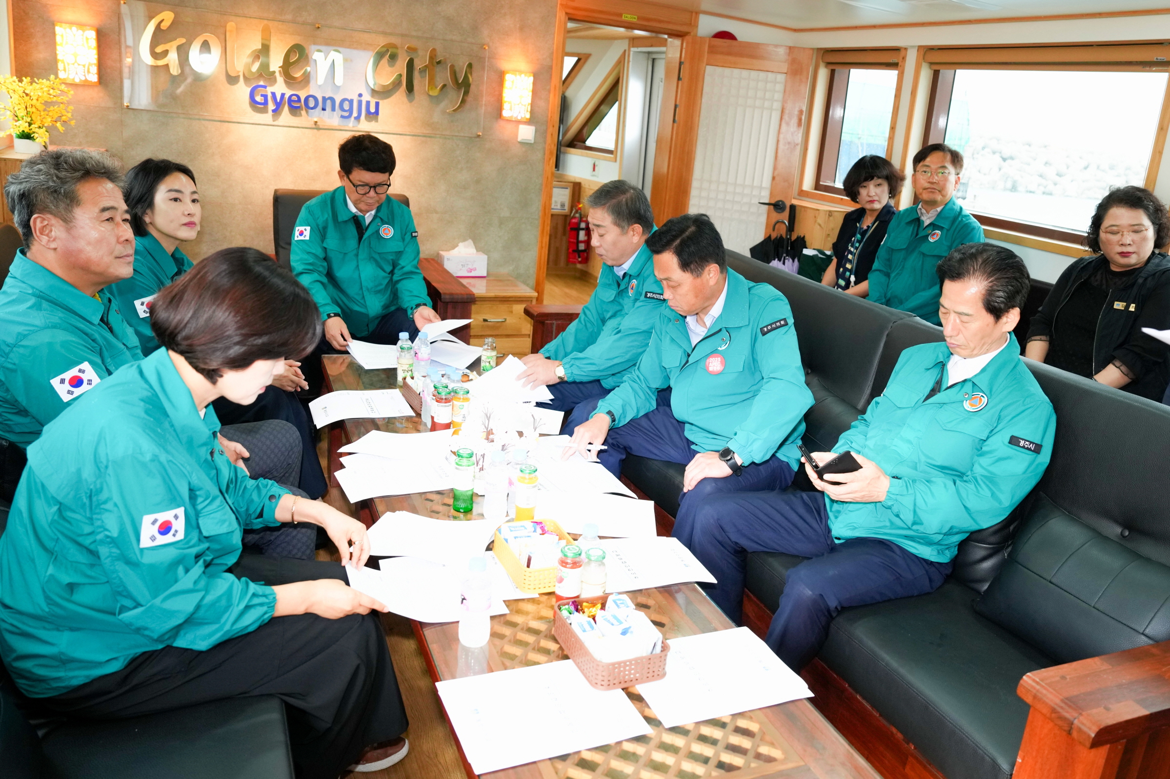 현장방문 일정의 첫 순서로 어업 지도단속, 해양오염 예찰, 해난사고 대응 등의 임무를 수행하는 해양복합행정선인 문무대왕호에 대하여 관련부서의 운항실적 보고가 진행됐으며, 행정선의 실제 업무와 역할을 확인하기 위해 위원들이 직접 문무대왕호에 탑승하고 체험하는 시간을 가졌다.