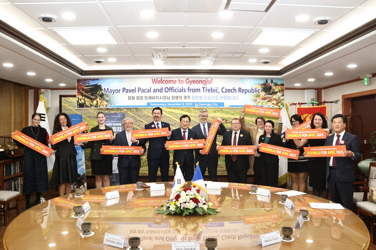 | ↑↑ 체코 트레비치시 대표단이 지난해 11월 경주시를 찾은 자리에서 ‘2025 APEC 정상회의 경주 유치 손 푯말’을 들고 기념촬영을 하고 있다 / 사진제공=경주시 |
