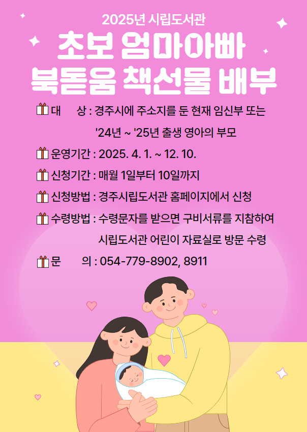 신청은 매월 10일까지 경주시립도서관 홈페이지에서 접수하며, 안내 문자를 받은 뒤 구비서류를 지참해 도서관을 방문하면 책선물을 받을 수 있다.