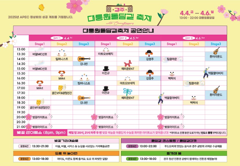 게다가 대릉원돌담길은 벚꽃이 피는 시기에는 별다른 공연이 없어도 수많은 관광객이 찾는 명소이다.