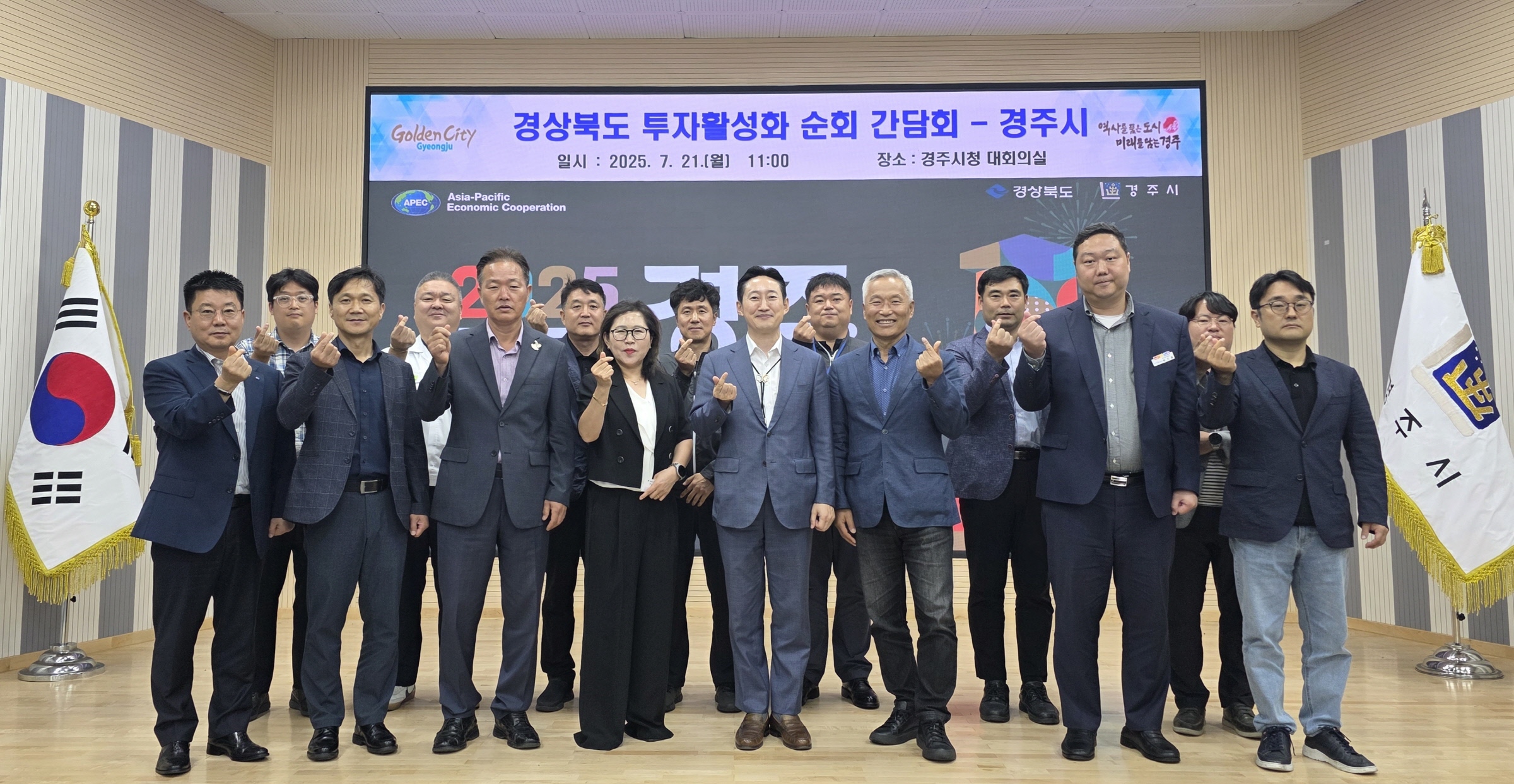 | ↑↑ 21일 경주시청 대회의실에서 열린 ‘경상북도 투자활성화 시·군 순회간담회’에 참석한 관계자들이 손가락 하트 포즈로 기념촬영을 하고 있다 / 사진제공=경주시 |