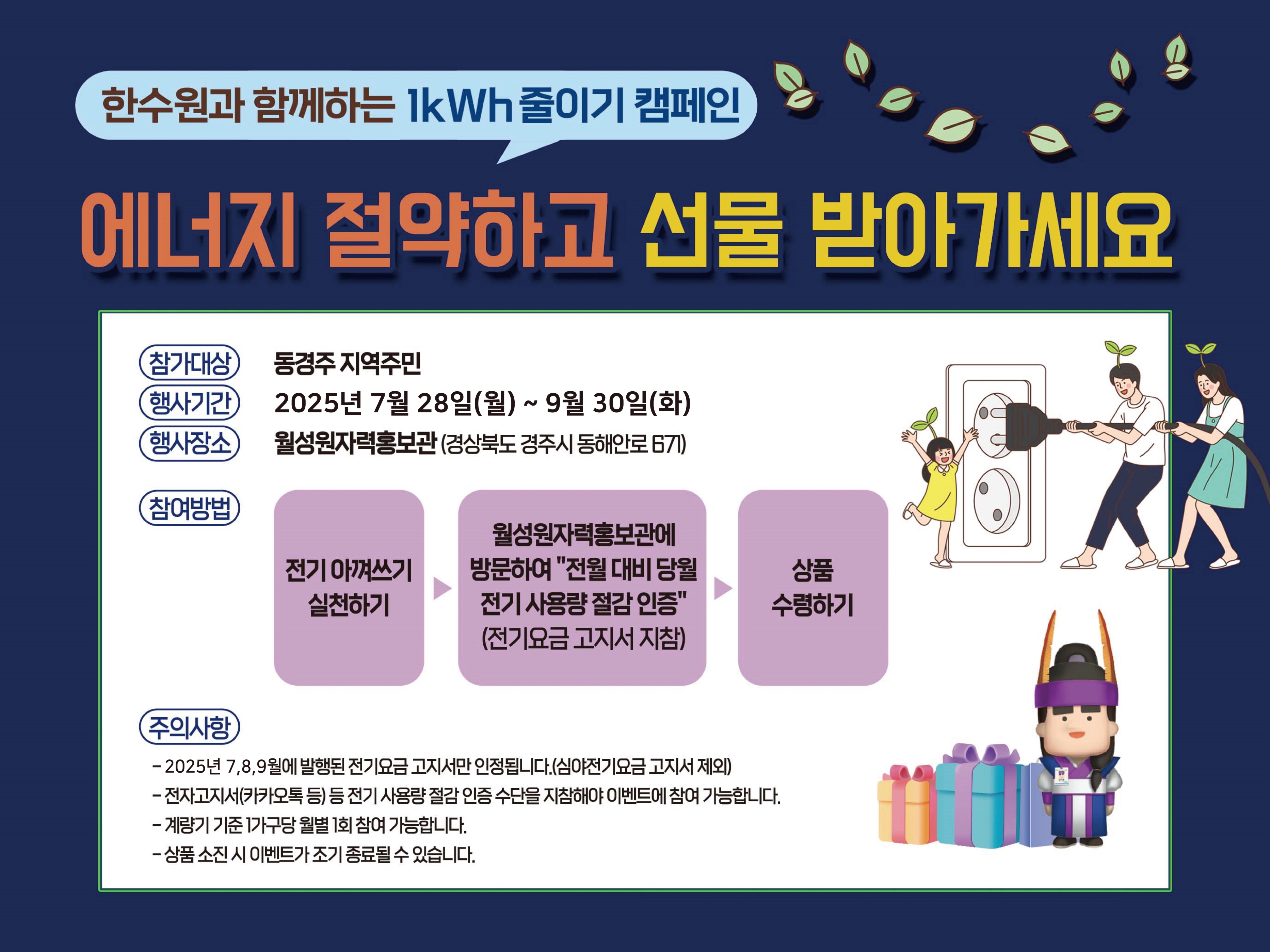 【경주=미디어인경북】 월성원자력본부(본부장 정원호)는 7월 28일부터 9월 30일까지 동경주 지역주민을 대상으로‘한수원과 함께하는 1kWh 줄이기 캠페인’을 시행한다.