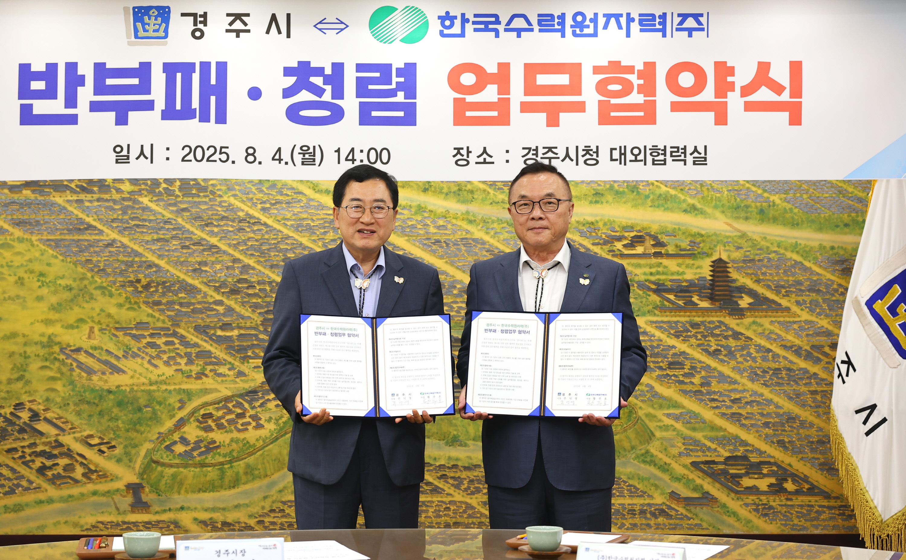 【경주=미디어인경북】 경주시가 청렴도 향상과 반부패 문화 확산을 위한 선도 행보에 나섰다. 시는 4일, 시청 대외협력실에서 한국수력원자력(주)(사장 황주호)과 ‘반부패·청렴업무 협약’을 체결하고, 청렴한 공직 문화 정착과 투명한 행정 실현을 위한 공동 실천에 본격 돌입했다고 밝혔다.