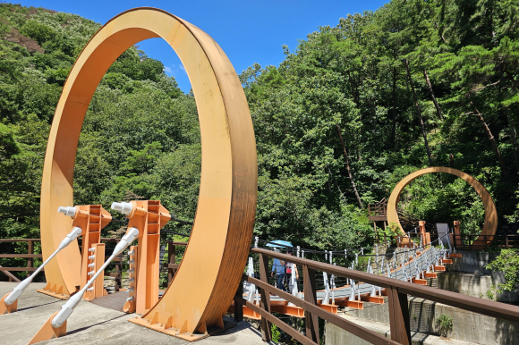 또한 폭포 앞으로는 덱 계단이 설치돼 있어 쉽게 접근할 수 있으며, 계곡을 가로지르는 오렌지빛 출렁다리는 초록 숲과 어우러져 이색적인 풍경을 연출한다.