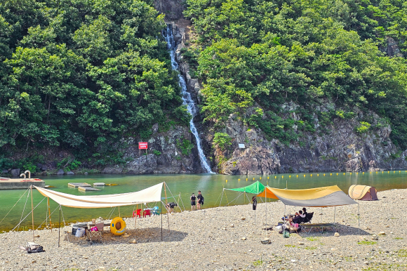 폭포 주변에는 넓은 계류와 하천변 공간이 마련돼 있어, 물놀이와 야영을 동시에 즐기려는 피서객들에게 큰 인기를 끌고 있다.