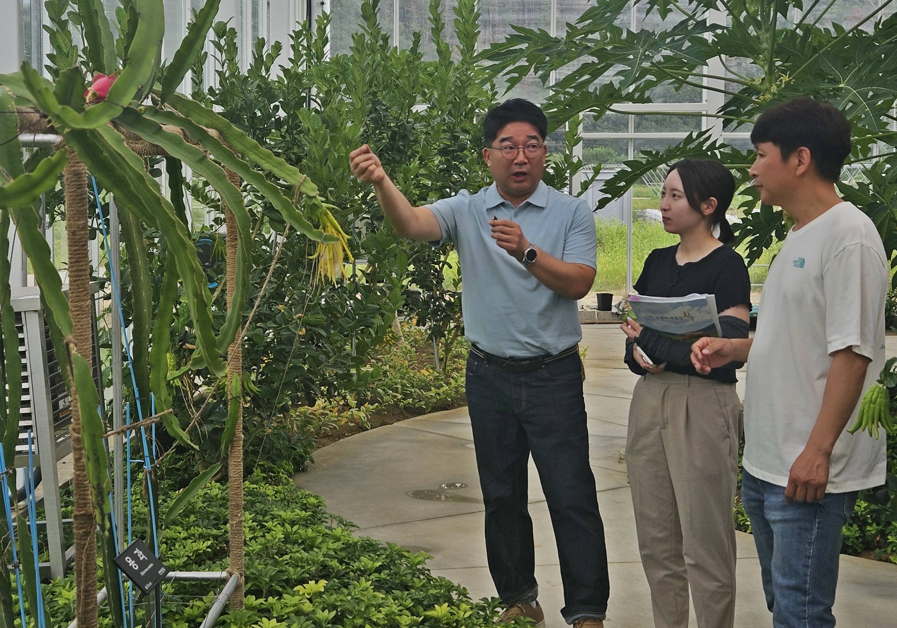 | ↑↑ 경주시 자매도시 일본 우사시청 소속 교류공무원 다카야마 아야노 씨(가운데)가 3일 경주시 농업기술센터를 방문해 관계자로부터 열대작물 재배 기술을 설명 듣고 있다 / 사진제공=경주시 |