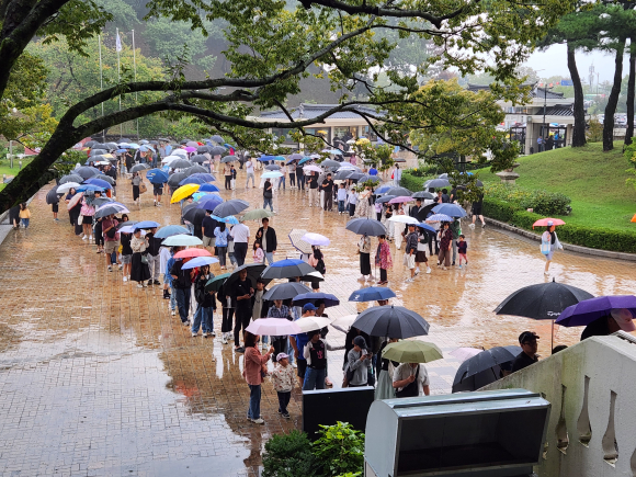 | ↑↑ 추석연휴 우천에도 불구하고 관람객들이 길게 줄을 서서 관람순서를 기다리고 있는 모습 / 사진제공=국립경주박물관 |