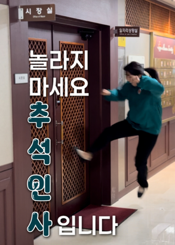| ↑↑ 경주시청 공무원이 시장실 문을 발로 차고 들어가는 장면으로, 문이 열리자 주낙영 경주시장이 등장해 “추석 인사드립니다”라고 전하며 웃음을 자아내고 있다. |