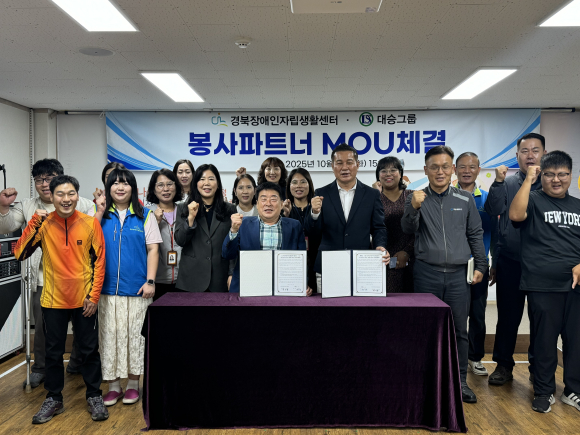 【경주=미디어인경북】 ‘대를 잇는 기업’ 대승그룹(회장 백승엽)은 지난 10월 14일 경북장애인자립생활센터(센터장 박귀룡)와 함께 지역 장애인복지 증진과 상호 협력을 위한 봉사파트너 업무협약(MOU)을 체결했다.