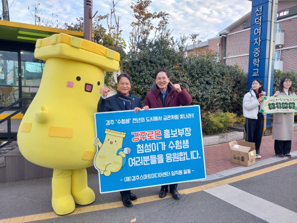 특히 경주를 대표하는 상징 캐릭터 첨성이는 긴장한 수험생들과 학부모에게 웃음과 위안을 주며 따뜻한 응원 현장을 만들었다.