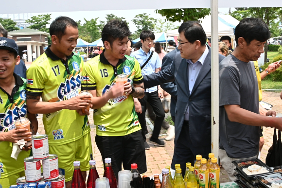 | ↑↑ 외국인 근로자 축제 현장에서 주낙영 경주시장(오른쪽에서 두 번째)이 참가자들과 대화를 나누고 있다 / 사진제공=경주시 |