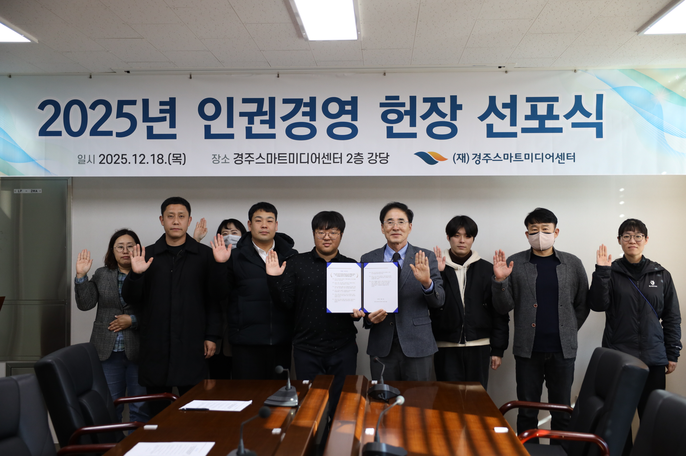 【경주=미디어인경북】 (재)경주스마트미디어센터(센터장 김장주)는 18일(목), 센터 2층 회의실에서 ‘인권경영 선포식’을 개최하고, 임직원과 함께 인권 존중 조직문화 확산과 ESG 경영 실천 의지를 공식적으로 선포했다.