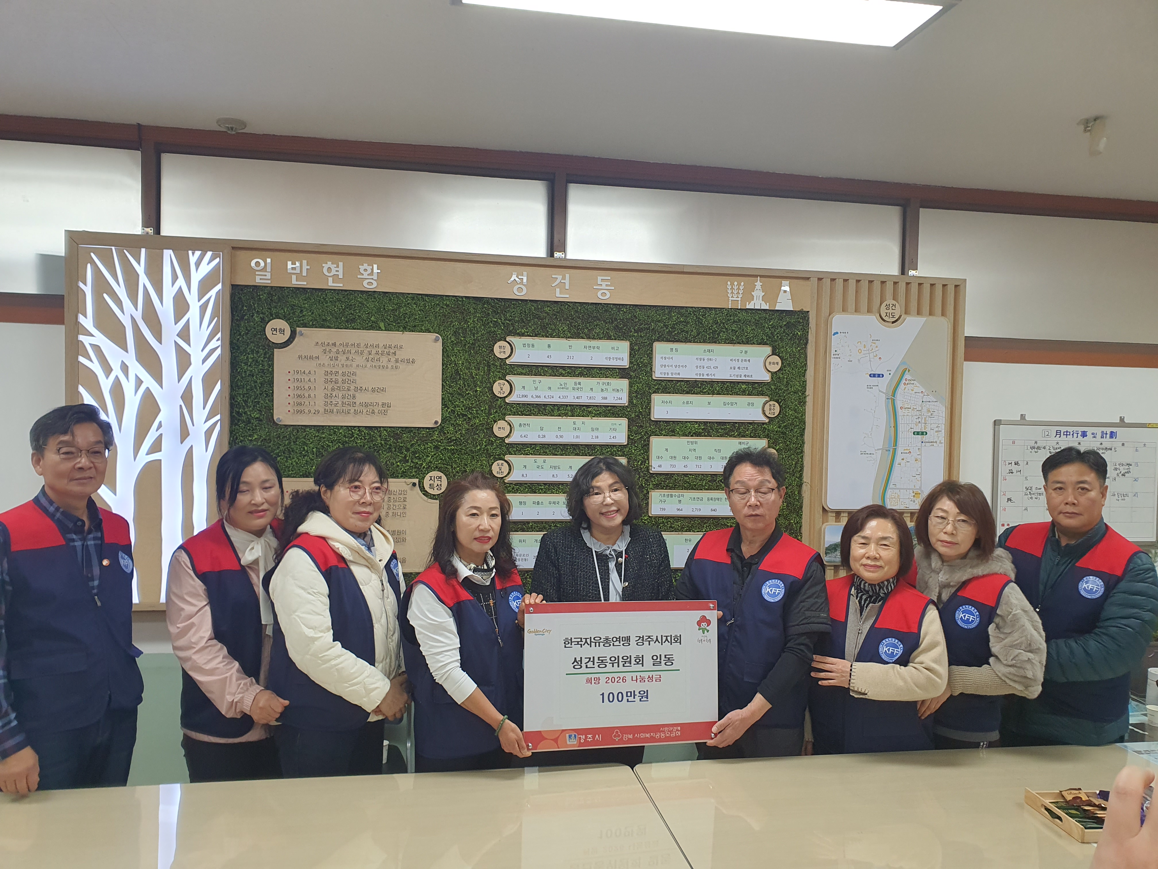【경주=미디어인경북】 한국자유총연맹 경주시지회 성건동위원회(위원장 이경우, 여성회장 권혜정)는 지난 16일(화) 어려운 이웃을 위한 희망 2026 나눔캠페인 성금 100만원을 기탁했다.