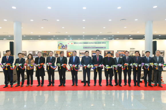 | ↑↑ 18일 경주엑스포대공원 엑스포문화센터에서 열린 ‘경주–나라시 자매결연 55주년 기념 사진전’ 개막식에서 주낙영 경주시장과 내빈들이 기념촬영을 하고 있다 / 사진제공=경주시 |