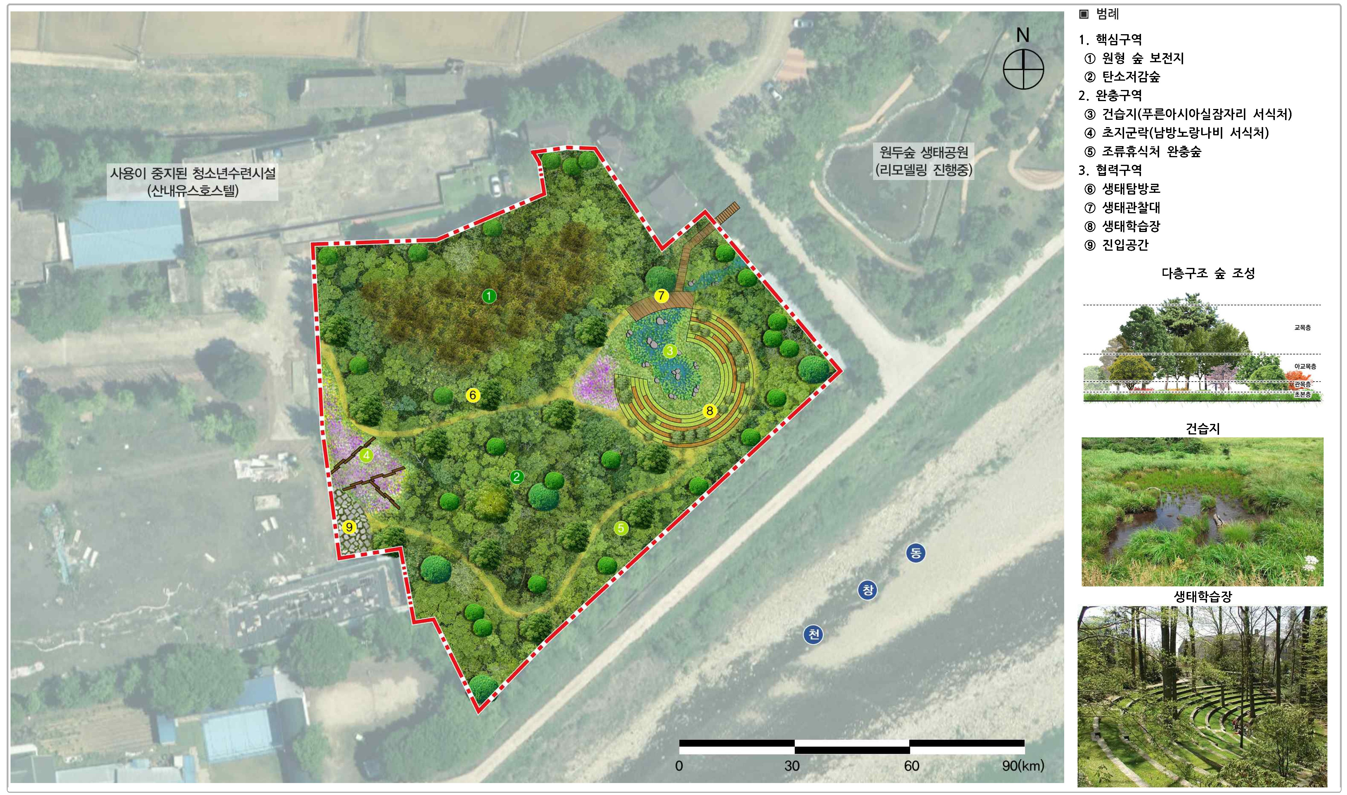 | ↑↑ 경주시 산내면 외칠리 원두숲생태공원 인접부지 생태복원사업 기본계획도. 숲, 습지 복원과 생태탐방, 학습 공간을 조성해 생태 환경교육 거점으로 육성한다 / 사진제공=경주시 |