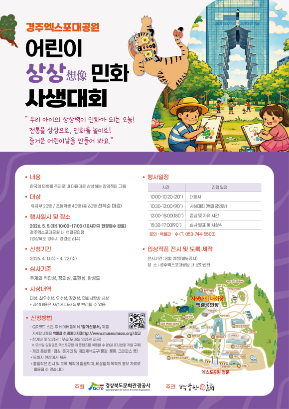 【경주/미디어인경북=김동철 기자】 경북문화관광공사(사장 김남일, 이하 공사)는 우리 민화의 아름다움을 현대적으로 계승하고 어린이들에게 창의적인 배움의 기회를 제공하고자, 오는 5월 5일 ‘어린이 상상(想像) 민화 사생대회’를 개최한다.
