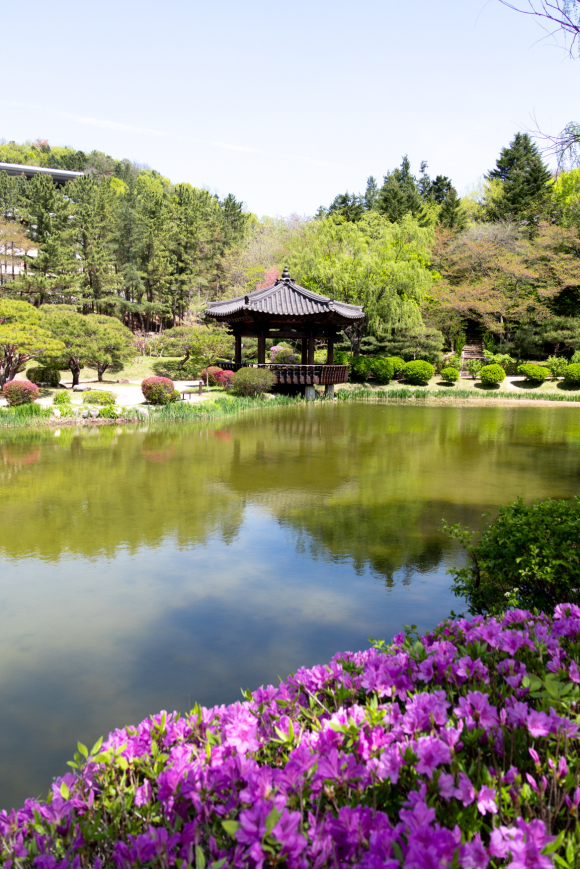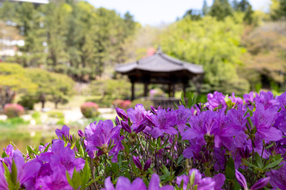 화려했던 벚꽃과는 또 다른 분위기로, 고즈넉한 연못과 어우러진 진달래 풍경이 방문객들에게 여유로운 시간을 선사하고 있다.