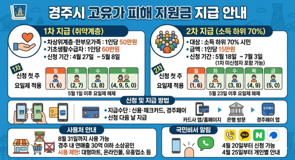 지급수단은 신용·체크카드 또는 경주페이 카드 중 선택할 수 있으며, 신청 다음 날 지급된다.